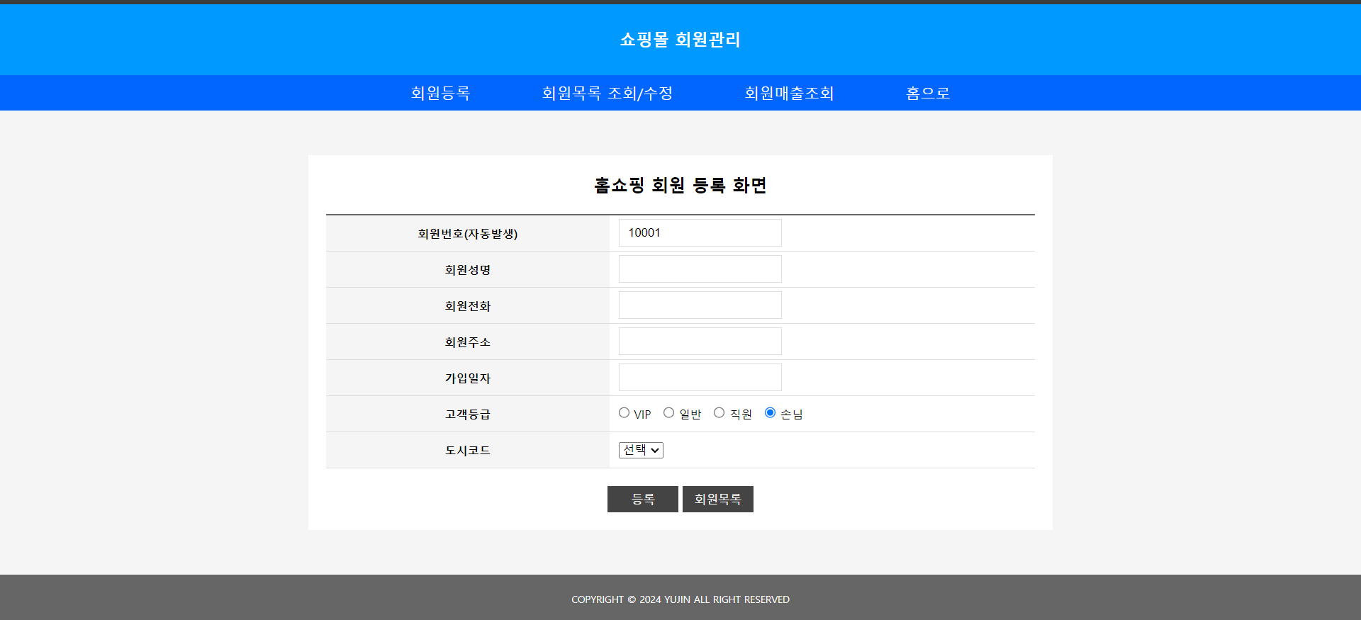 홈쇼핑 고객과 매출관리를 위한 프로그램이다. 회원등록 및 수정∙삭제, 회원 조회, 회원매출조회 업무가 가능하도록 하는 프로그램을 본 포스팅에서 다뤄보겠다.