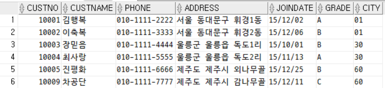 custno number(6) primary key -- 회원번호 숫자(6) 기본키 번호자동증가