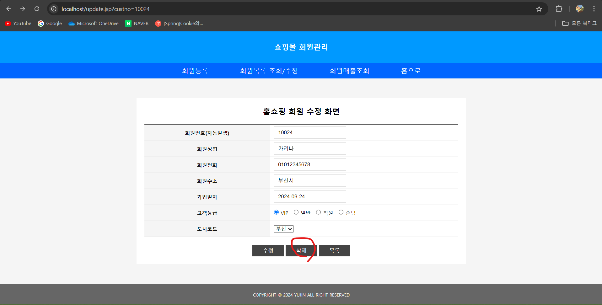 - custno: 클라이언트에서 요청한 파라미터(custno)를 받아온다. 이 값은 삭제할 회원의 고객 번호를 의미